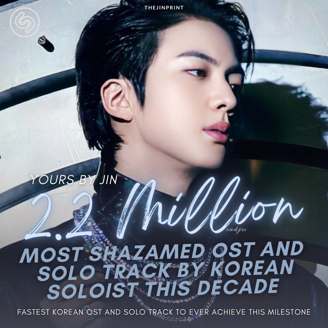 На прошлой неделе Джин стал 1-м солистом K-pop, попавшим в глобальный чарт Shazam. Его первый саундтрек «Yours» стал самым громким саундтреком во всем мире. Это также самая длинная корейская песня, которая остается №1 в указанном чарте.
